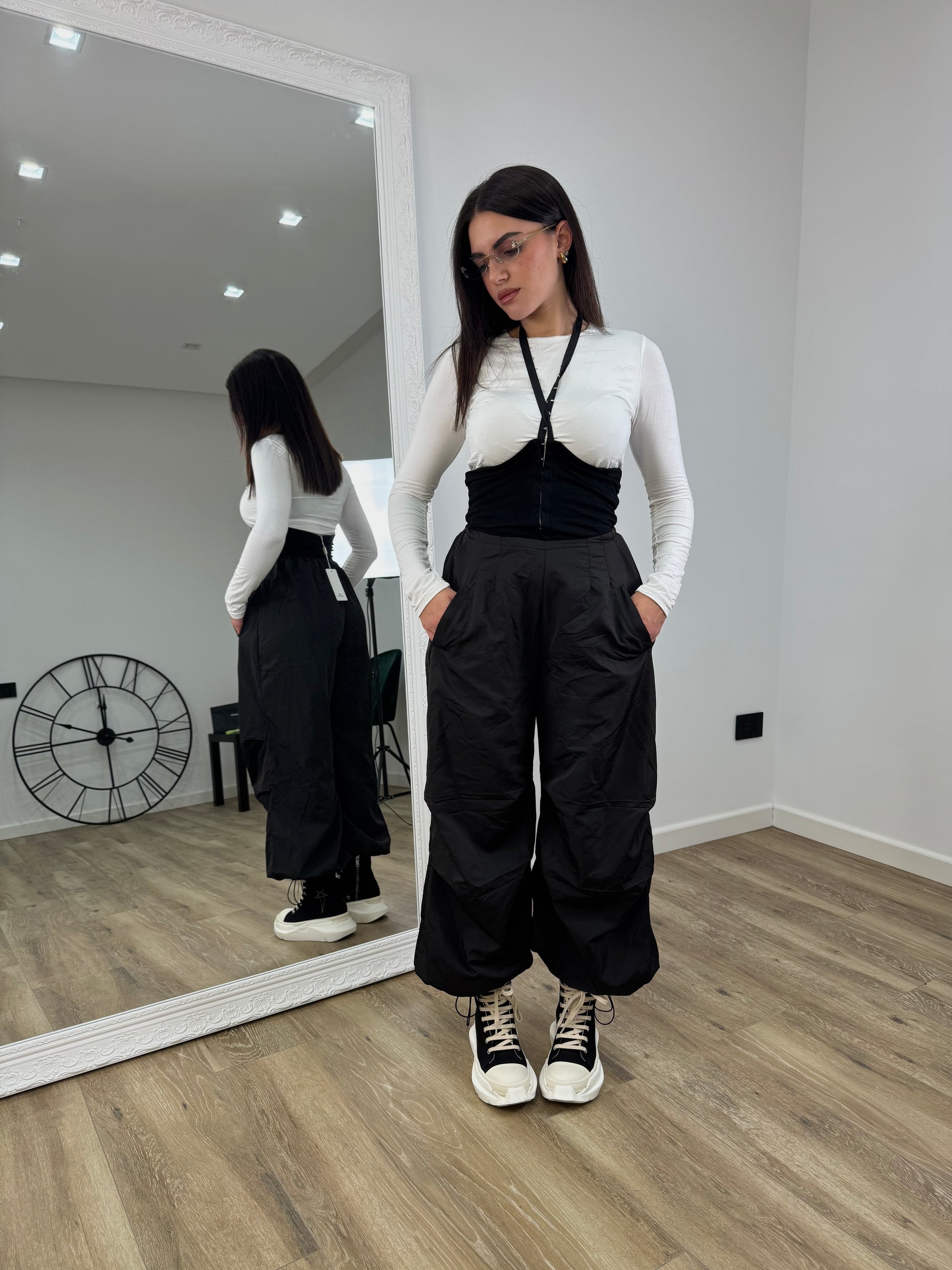 Cargo Bustier Nero è caratterizzato da un bustino regolabile che consente una vestibilità su misura, offrendo supporto e comfort personalizzati. Questo capo unisce un design funzionale a un’estetica contemporanea, ideale per creare outfit versatili e moderni. La sua struttura permette libertà di movimento senza rinunciare a un look definito e raffinato.
