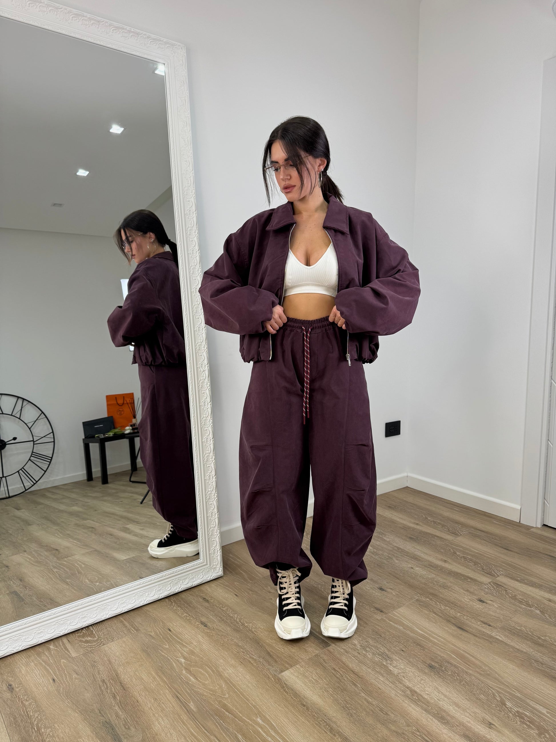 Il coordset nero sportivo include una giacca crop con chiusura zip, progettata per offrire massima praticità e un look dinamico. Il pantalone ballon, caratterizzato da pence, è dotato di laccio e molla in vita per una vestibilità regolabile che garantisce comfort durante ogni movimento. Questo completo unisce design contemporaneo e funzionalità ,casual con stile.